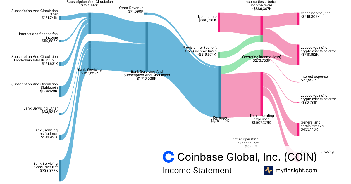 For the year ending 2025-12-31, COIN made $7,181,325K in revenue. $1,260,327K in net income. Net profit margin of 17.55%.
