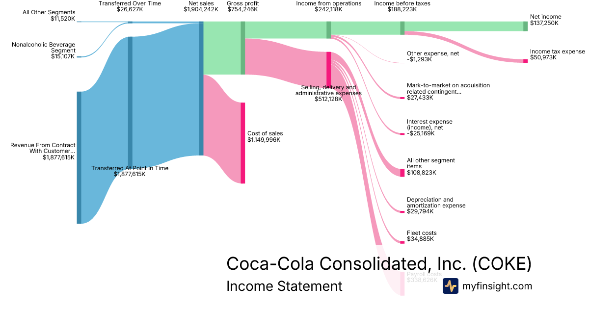 For the year ending 2025-12-31, COKE made $7,228,055K in revenue. $570,582K in net income. Net profit margin of 7.89%.