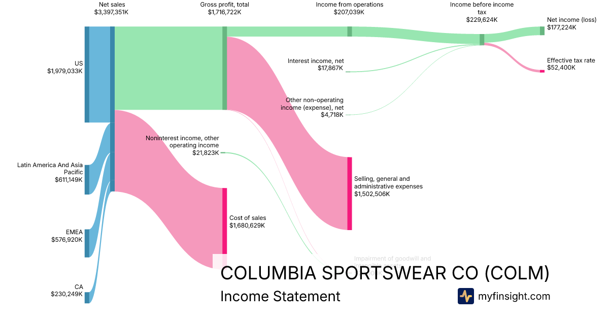 For the year ending 2025-12-31, COLM made $3,397,351K in revenue. $177,224K in net income. Net profit margin of 5.22%.