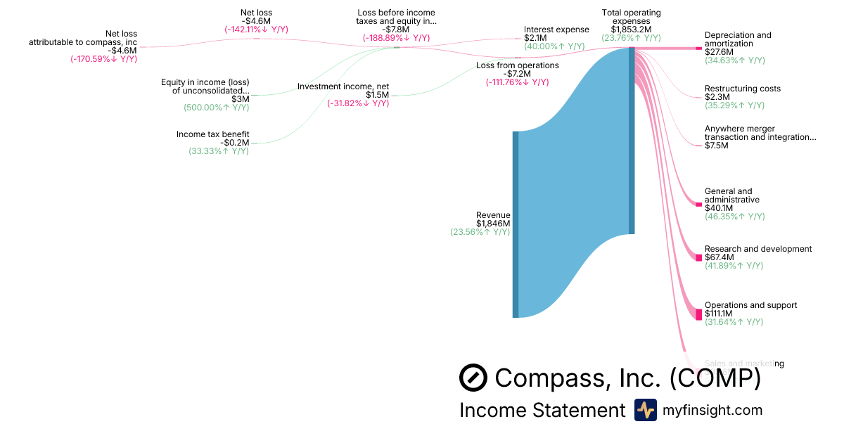 For the quarter ending 2025-09-30, COMP made $1,846,000K in revenue. -$4,600K in net income. Net profit margin of -0.25%.