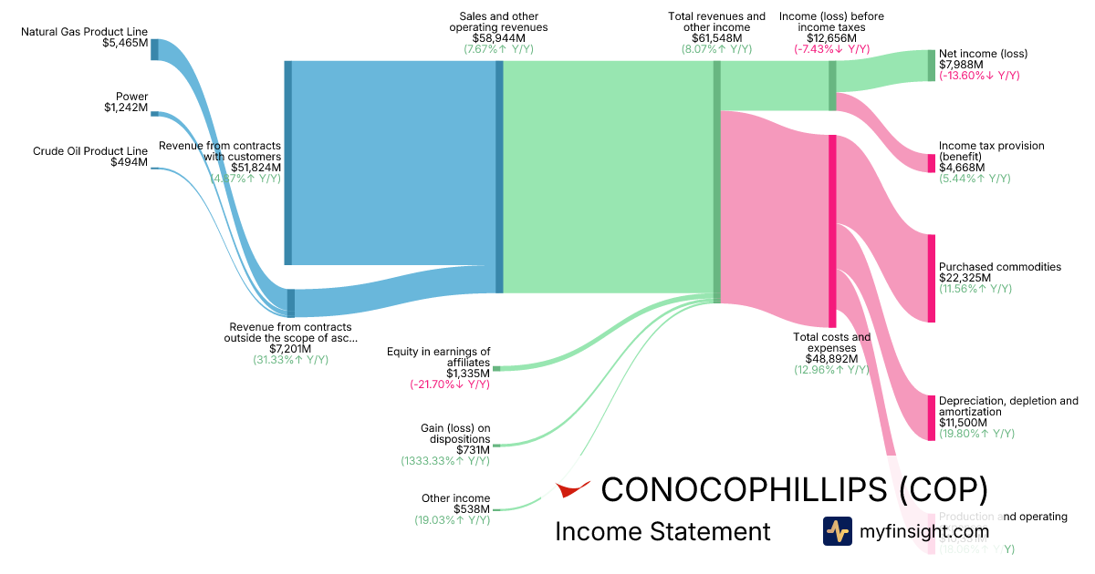 For the year ending 2025-12-31, COP made $58,944M in revenue. $7,988M in net income. Net profit margin of 13.55%.