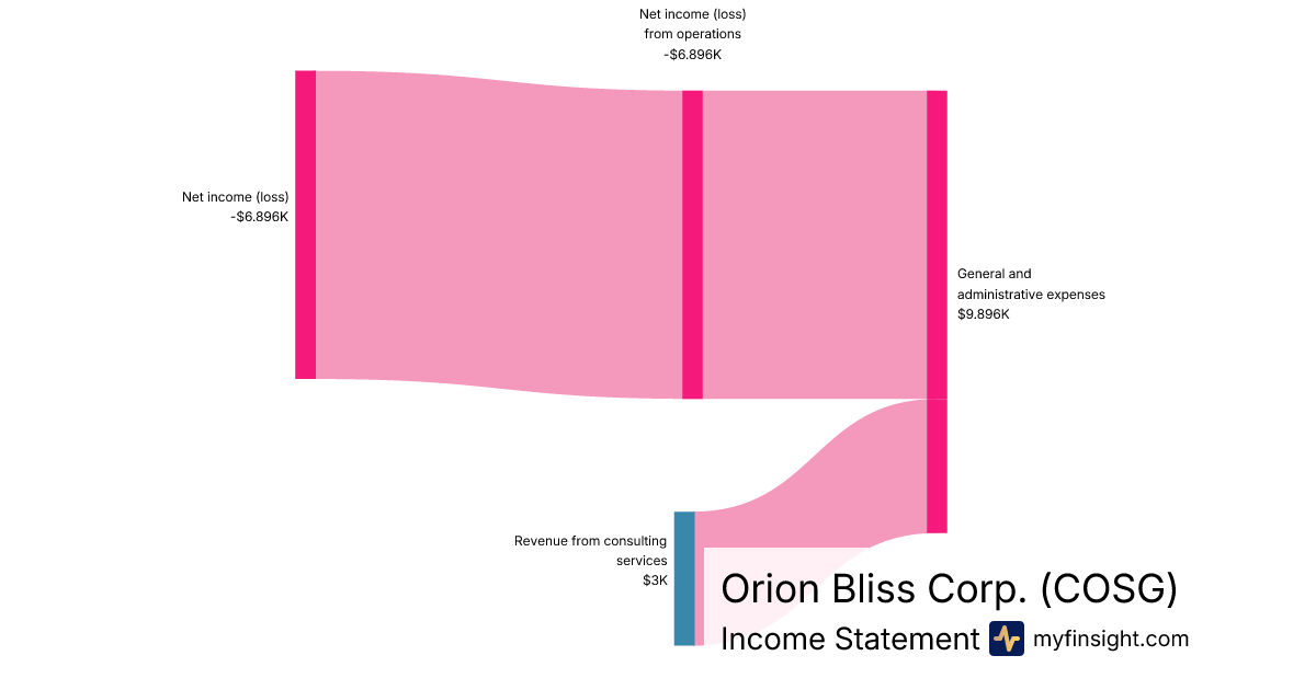 For the quarter ending 2025-10-31, COSG made $3K in revenue. -$6.896K in net income. Net profit margin of -229.87%.