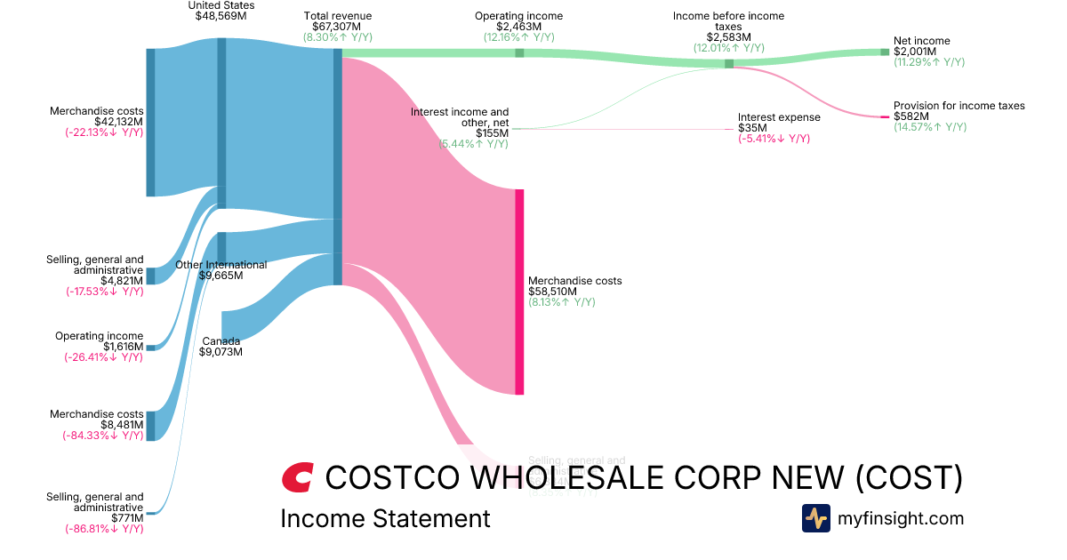 For the quarter ending 2025-11-23, COST made $67,307M in revenue. $2,001M in net income. Net profit margin of 2.97%.