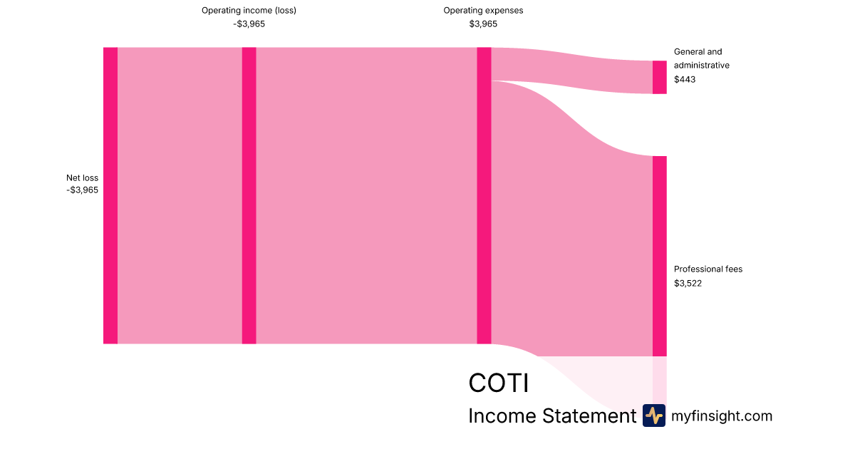 For the quarter ending 2024-06-30, COTI made $3,965 in revenue. -$3,965 in net income. Net profit margin of -100.00%.