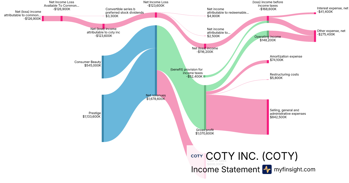 For the quarter ending 2025-12-31, COTY made $1,626,200K in revenue. -$126,900K in net income. Net profit margin of -7.80%.