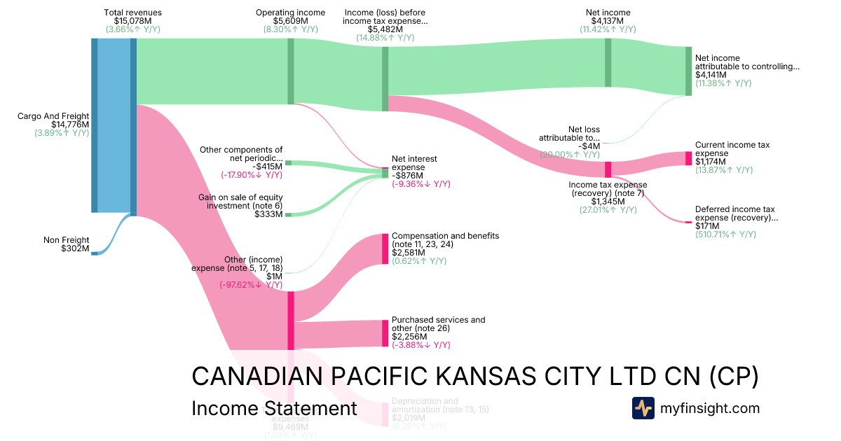 For the year ending 2025-12-31, CP made $15,078M in revenue. $4,141M in net income. Net profit margin of 27.46%.