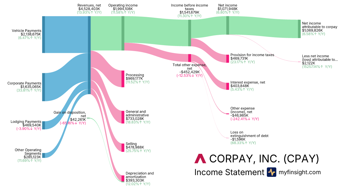 For the year ending 2025-12-31, CPAY made $4,528,403K in revenue. $1,069,826K in net income. Net profit margin of 23.62%.