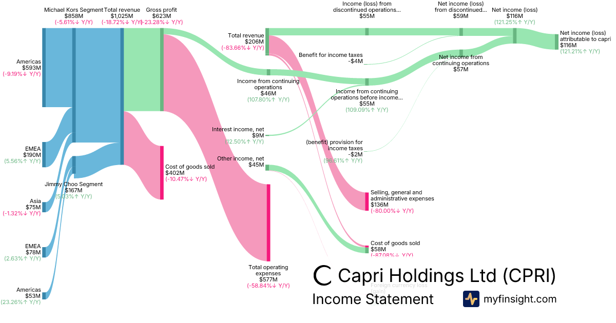 For the quarter ending 2025-12-27, CPRI made $1,025M in revenue. $116M in net income. Net profit margin of 11.32%.