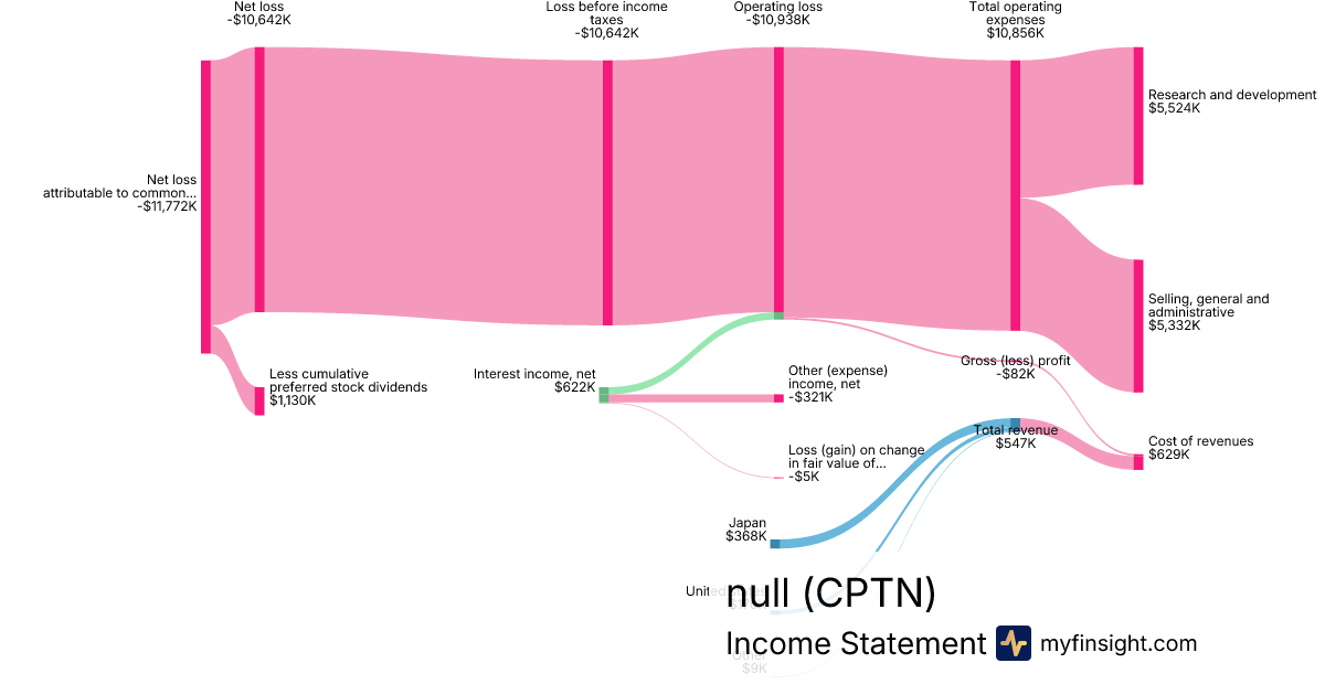 For the quarter ending 2024-09-30, CPTN made $547K in revenue. -$11,772K in net income. Net profit margin of -2152.10%.