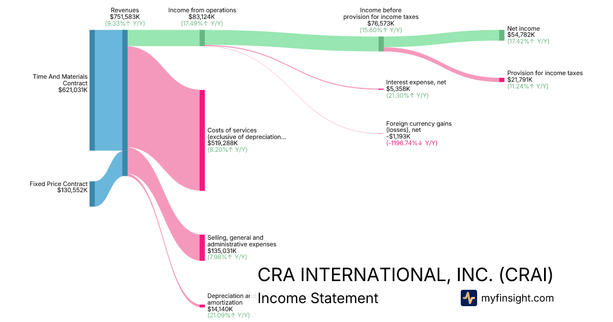 For the year ending 2026-01-03, CRAI made $751,583K in revenue. $54,782K in net income. Net profit margin of 7.29%.
