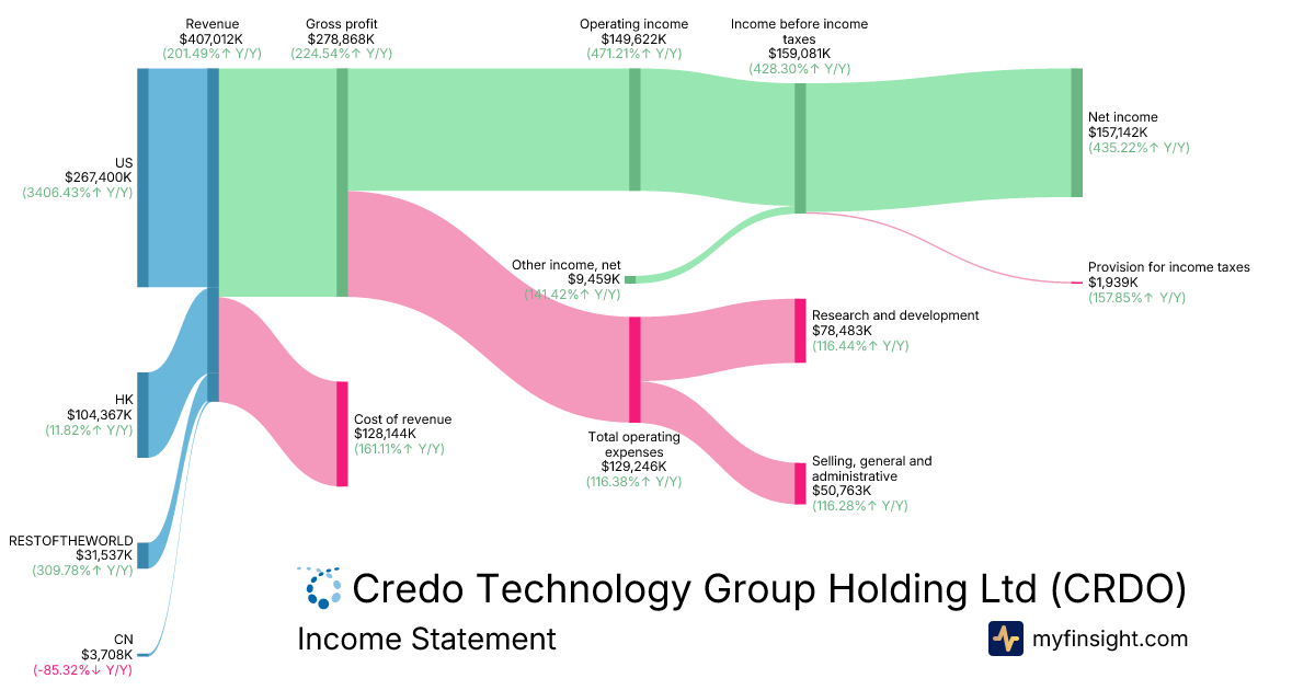 For the quarter ending 2026-01-31, CRDO made $407,012K in revenue. $157,142K in net income. Net profit margin of 38.61%.