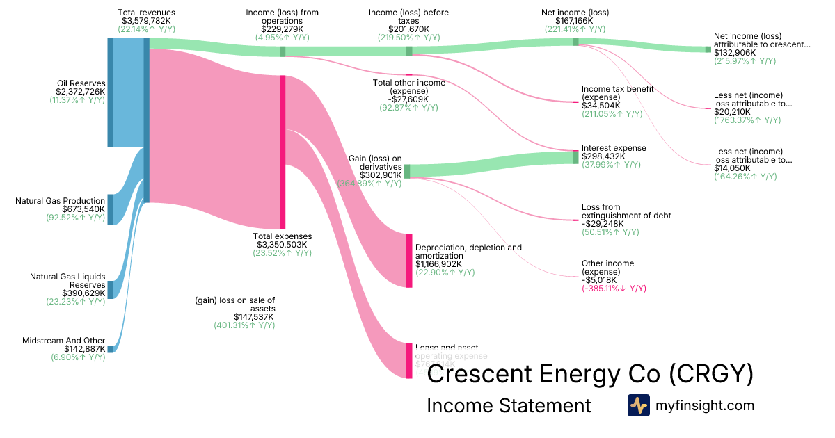 For the year ending 2025-12-31, CRGY made $3,579,782K in revenue. $132,906K in net income. Net profit margin of 3.71%.