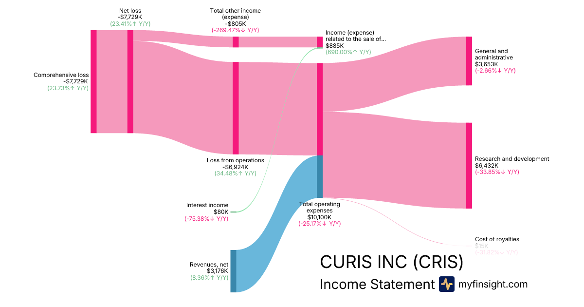 For the quarter ending 2025-09-30, CRIS made $3,176,000 in revenue. -$7,729,000 in net income. Net profit margin of -243.36%.