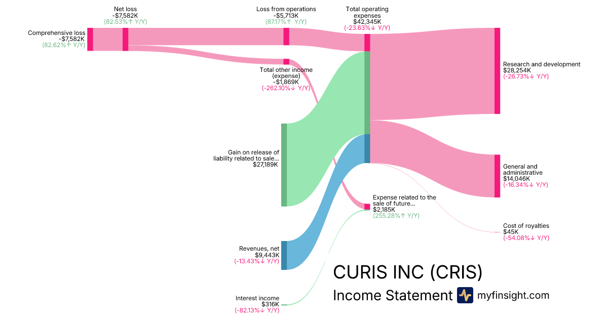 For the year ending 2025-12-31, CRIS made $9,443K in revenue. -$7,582K in net income. Net profit margin of -80.29%.
