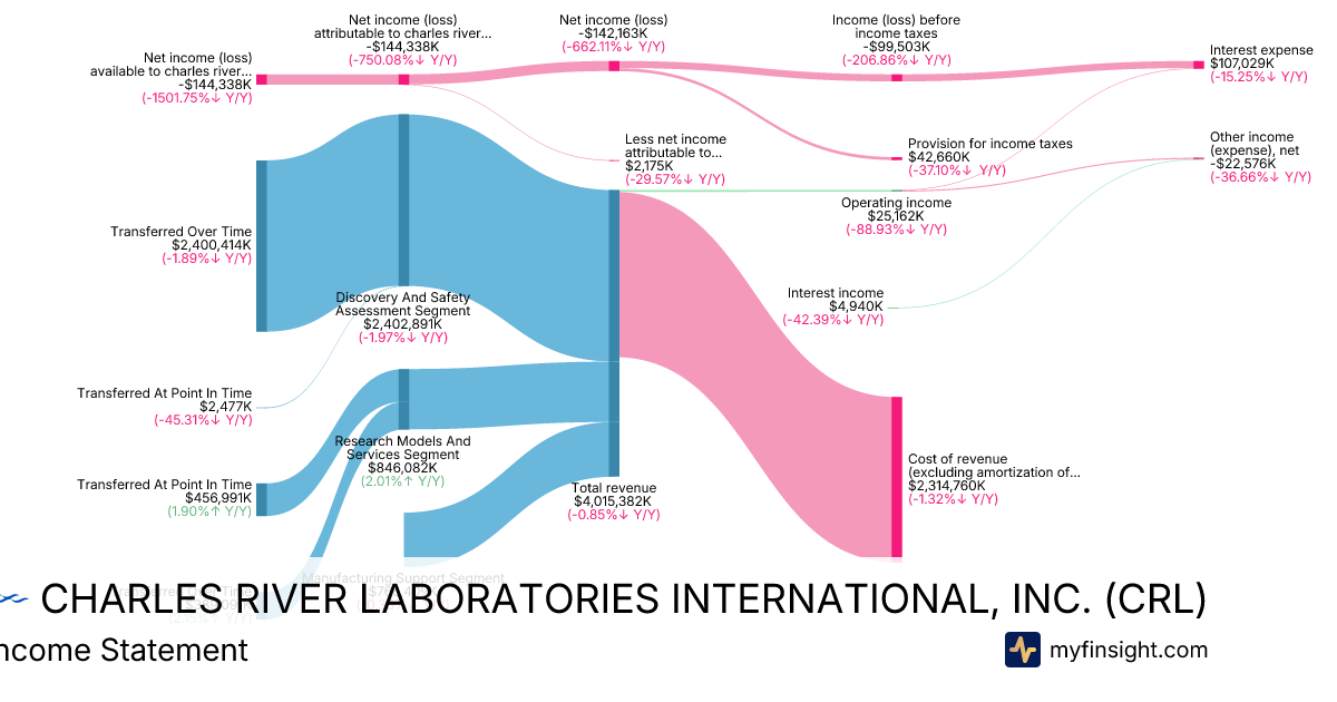 For the year ending 2025-12-27, CRL made $4,015,382K in revenue. -$144,338K in net income. Net profit margin of -3.59%.