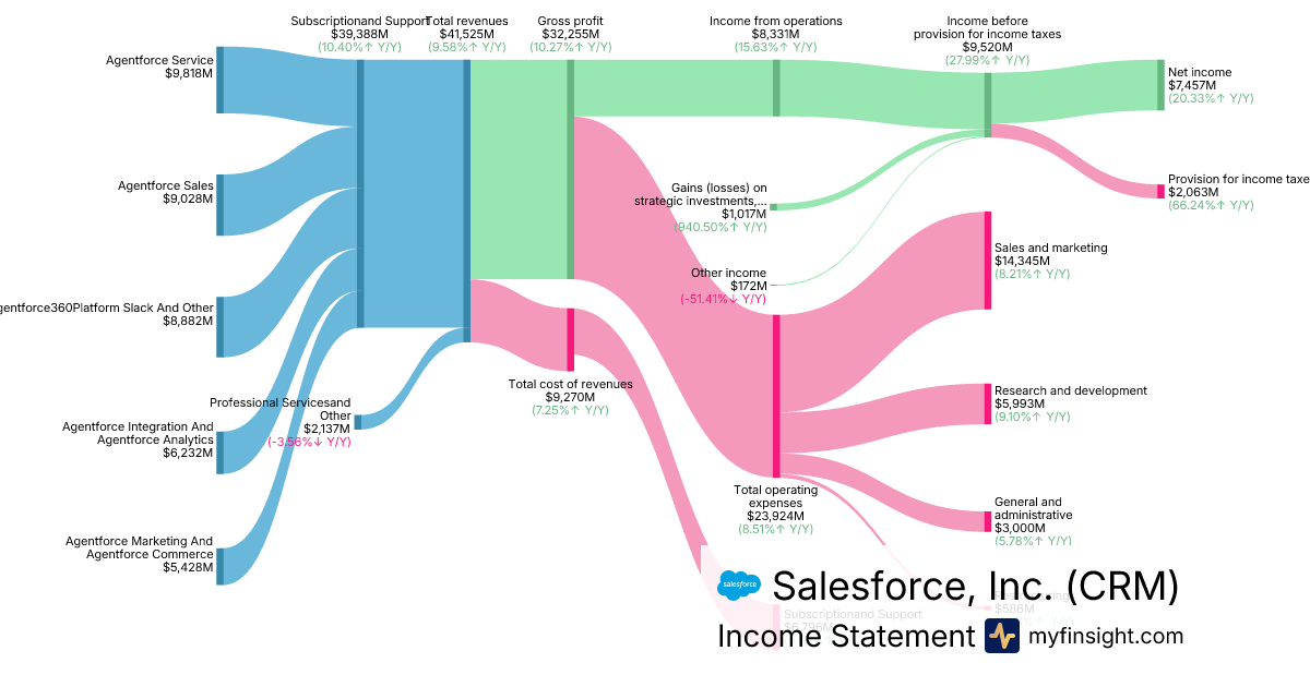 For the year ending 2026-01-31, CRM made $41,525M in revenue. $7,457M in net income. Net profit margin of 17.96%.