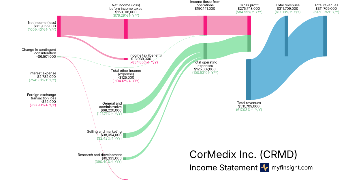 For the year ending 2025-12-31, CRMD made $311,709,000 in revenue. $163,055,000 in net income. Net profit margin of 52.31%.