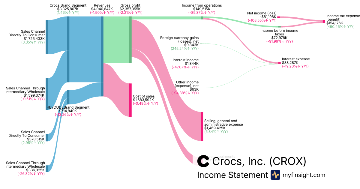For the year ending 2025-12-31, CROX made $4,040,647K in revenue. -$81,198K in net income. Net profit margin of -2.01%.