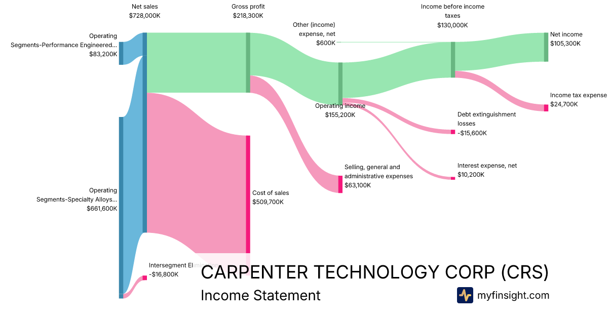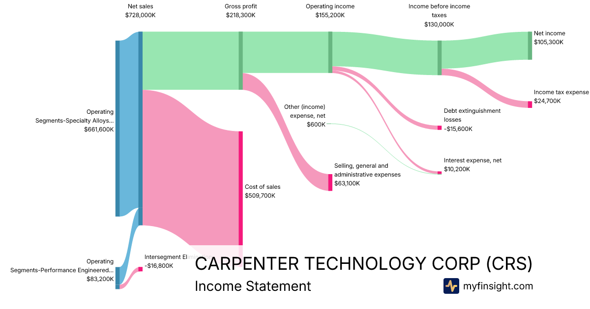 For the quarter ending 2025-12-31, CRS made $728,000K in revenue. $105,300K in net income. Net profit margin of 14.46%.