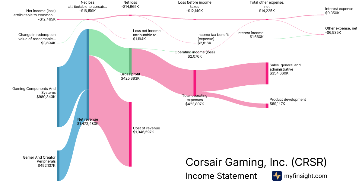 For the year ending 2025-12-31, CRSR made $1,472,480K in revenue. -$12,465K in net income. Net profit margin of -0.85%.