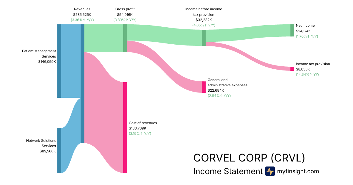 For the quarter ending 2025-12-31, CRVL made $235,625K in revenue. $24,174K in net income. Net profit margin of 10.26%.