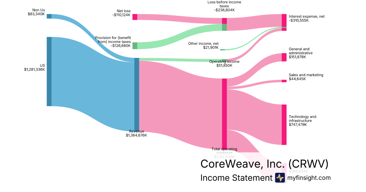 For the quarter ending 2025-09-30, CRWV made $1,364,676K in revenue. -$110,124K in net income. Net profit margin of -8.07%.