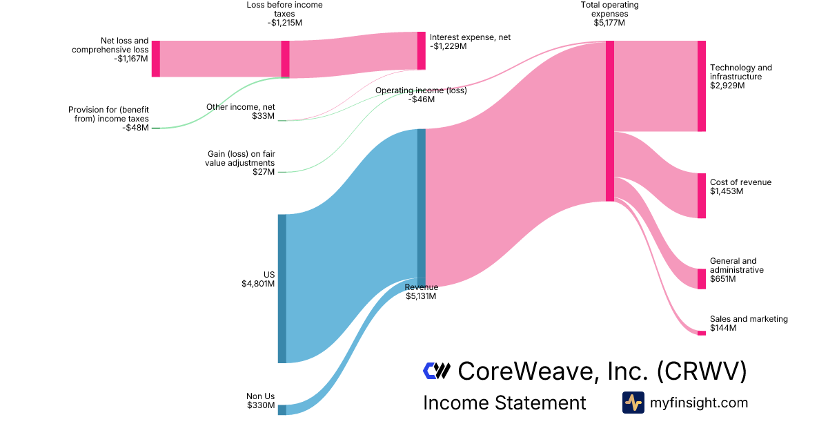 For the year ending 2025-12-31, CRWV made $5,131M in revenue. -$1,167M in net income. Net profit margin of -22.74%.