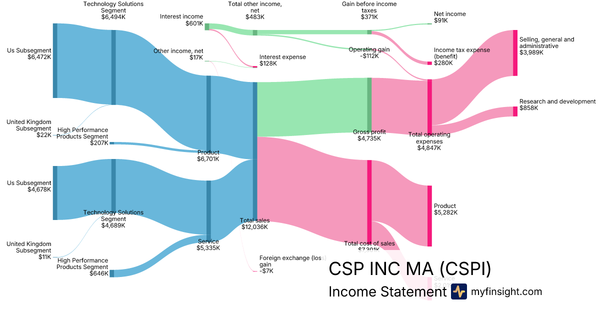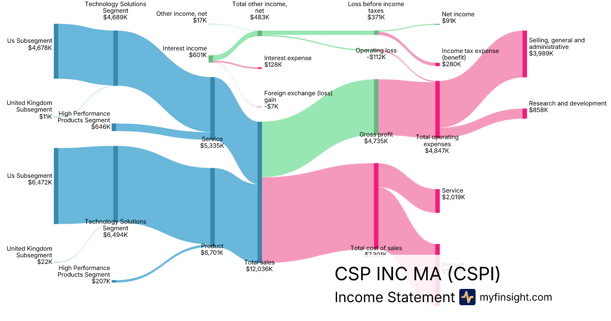 For the quarter ending 2025-12-31, CSPI made $12,036K in revenue. $91K in net income. Net profit margin of 0.76%.