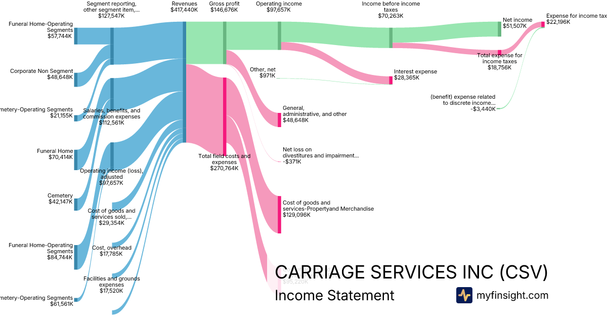 For the year ending 2025-12-31, CSV made $417,440K in revenue. $51,507K in net income. Net profit margin of 12.34%.