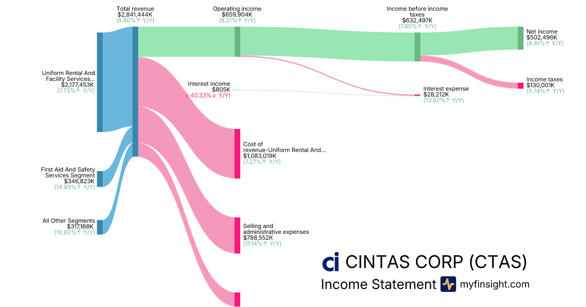 For the quarter ending 2026-02-28, CTAS made $2,841,444K in revenue. $502,496K in net income. Net profit margin of 17.68%.