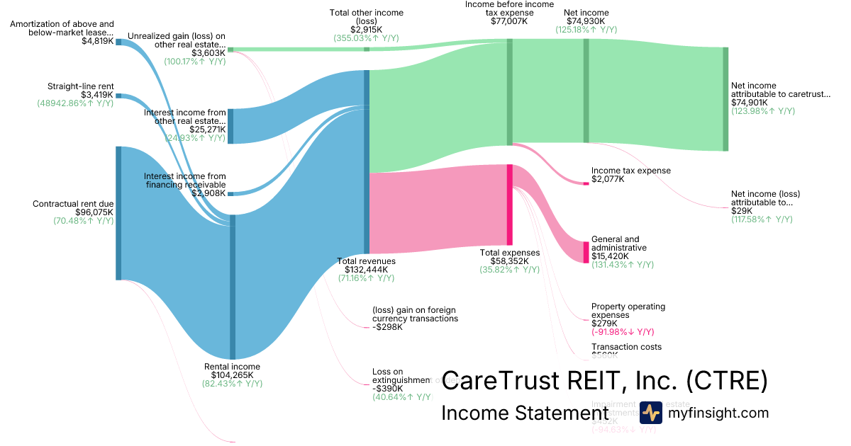 For the quarter ending 2025-09-30, CTRE made $132,444K in revenue. $74,901K in net income. Net profit margin of 56.55%.