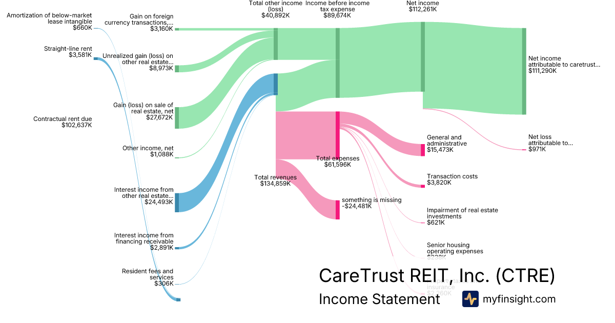 For the year ending 2025-12-31, CTRE made $476,393K in revenue. $320,538K in net income. Net profit margin of 67.28%.