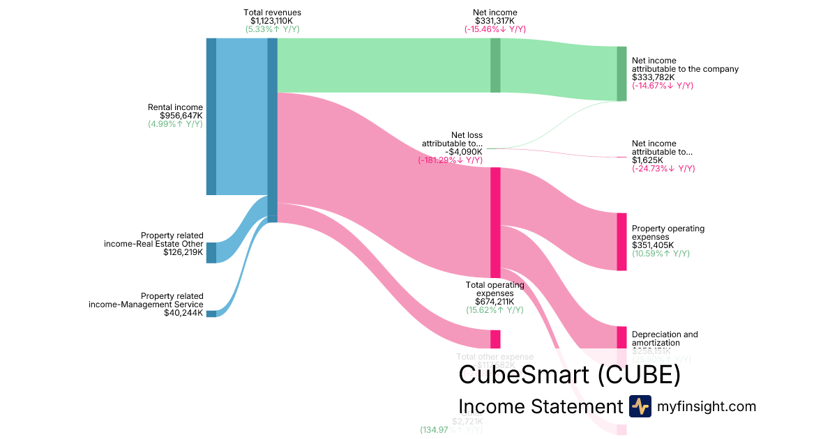 For the year ending 2025-12-31, CUBE made $1,123,110K in revenue. $333,782K in net income. Net profit margin of 29.72%.