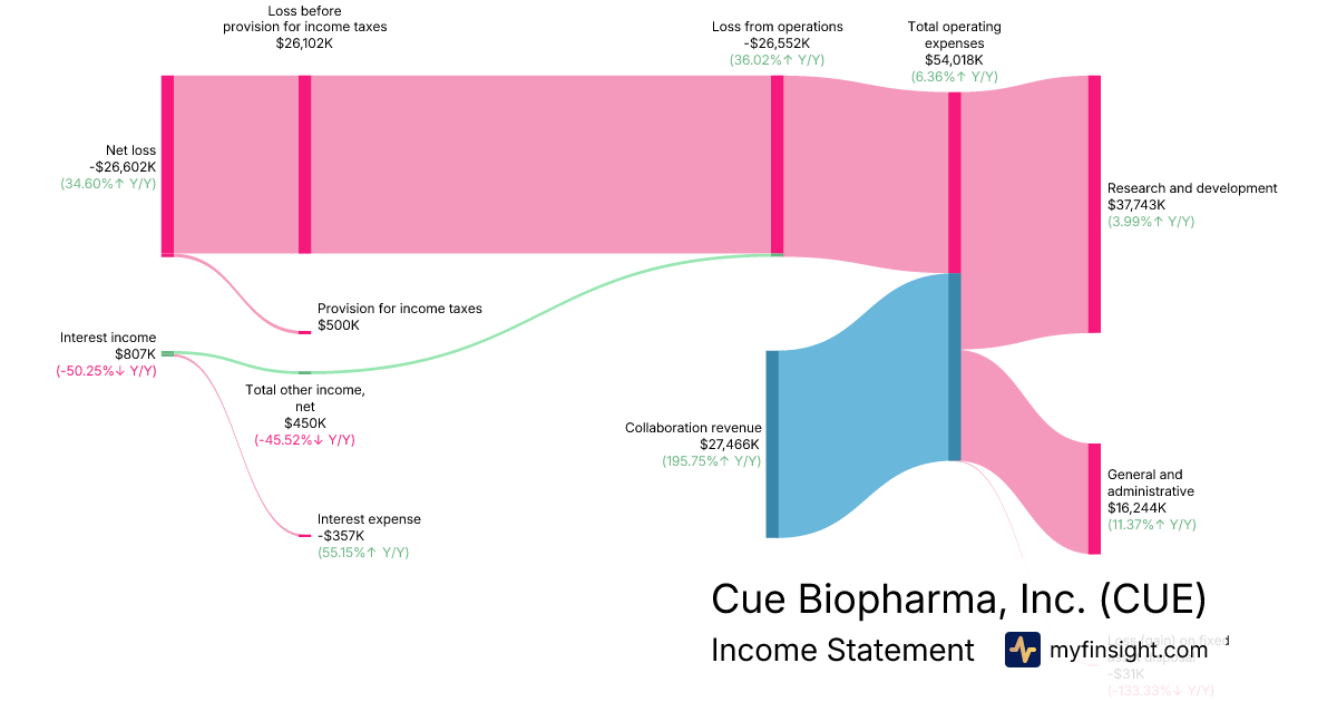 For the year ending 2025-12-31, CUE made $27,466K in revenue. -$26,602K in net income. Net profit margin of -96.85%.