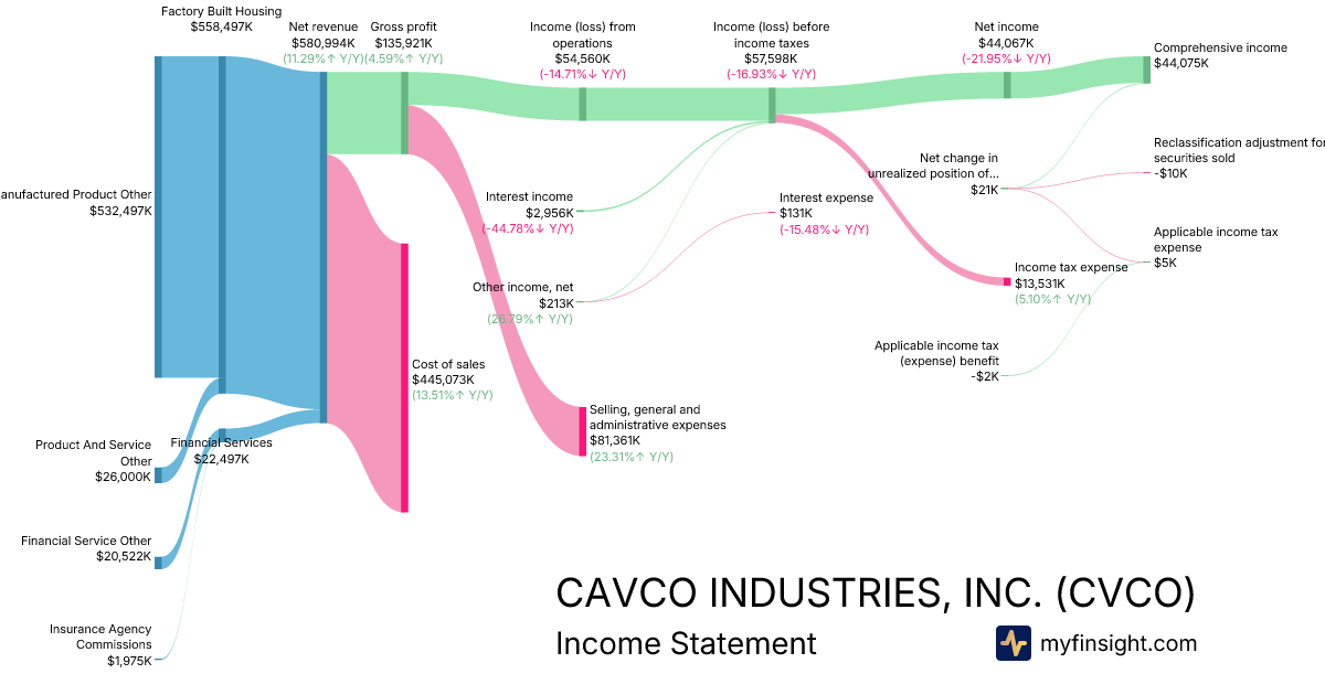 For the quarter ending 2025-12-27, CVCO made $580,994K in revenue. $44,075K in net income. Net profit margin of 7.59%.