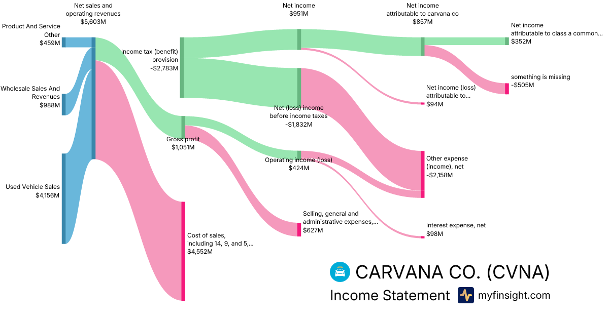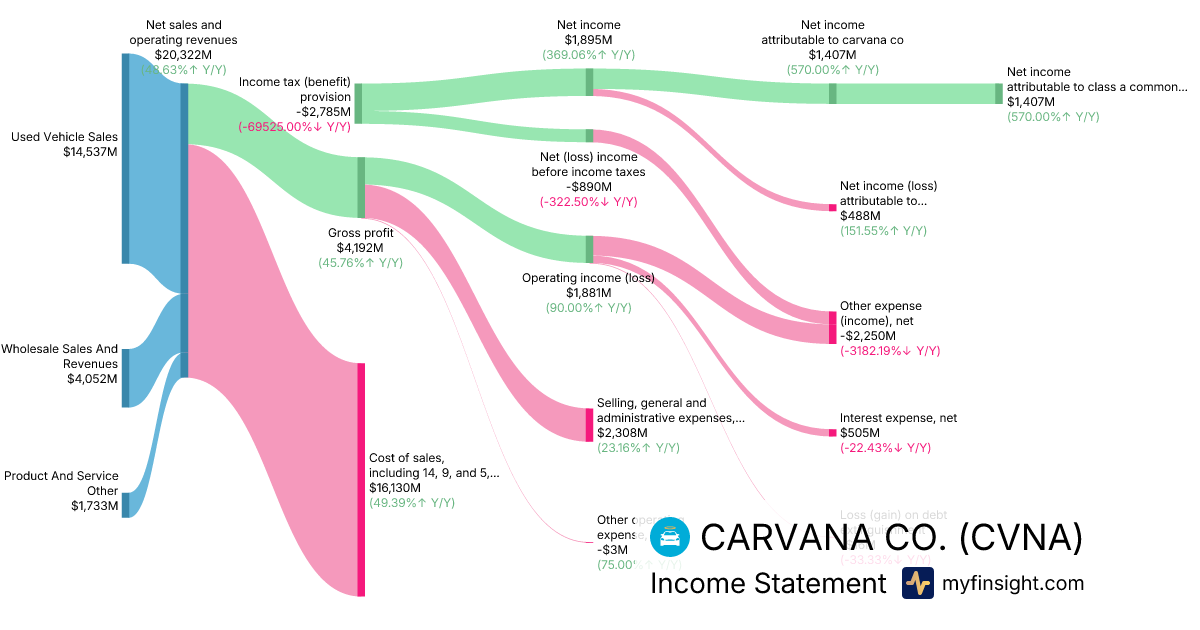 For the year ending 2025-12-31, CVNA made $20,322M in revenue. $1,407M in net income. Net profit margin of 6.92%.