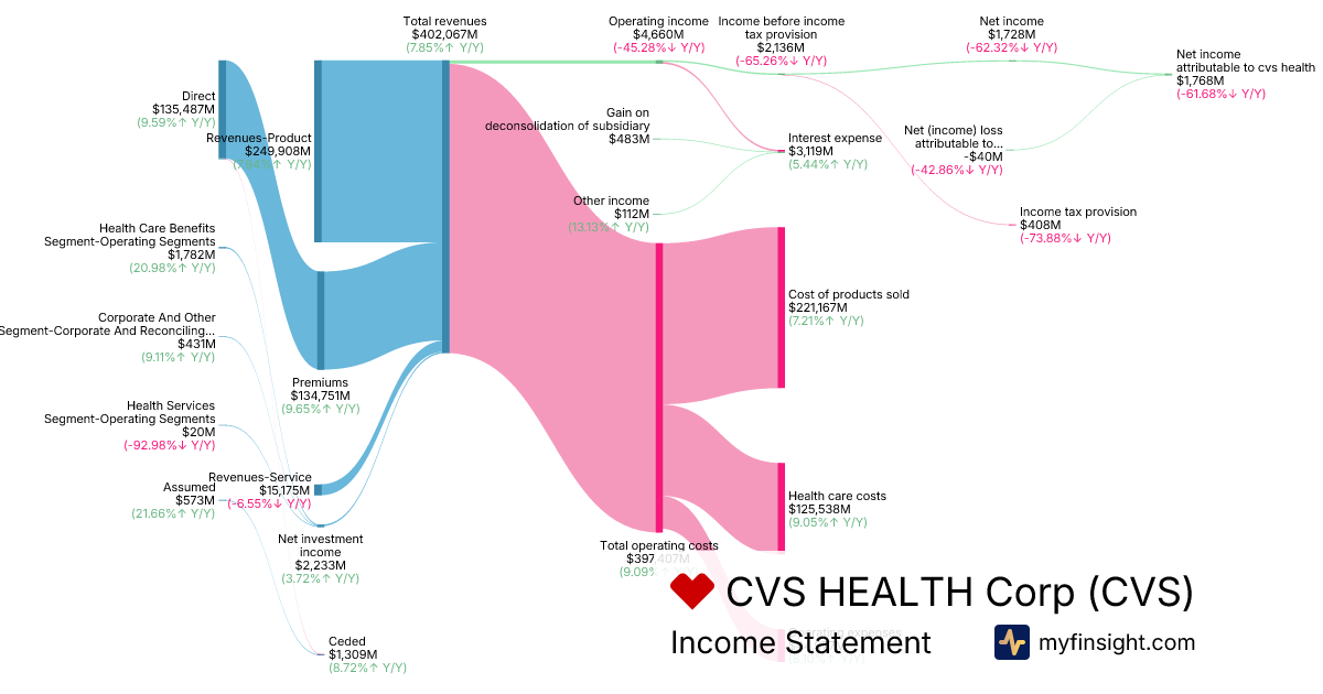 For the year ending 2025-12-31, CVS made $402,067M in revenue. $1,768M in net income. Net profit margin of 0.44%.