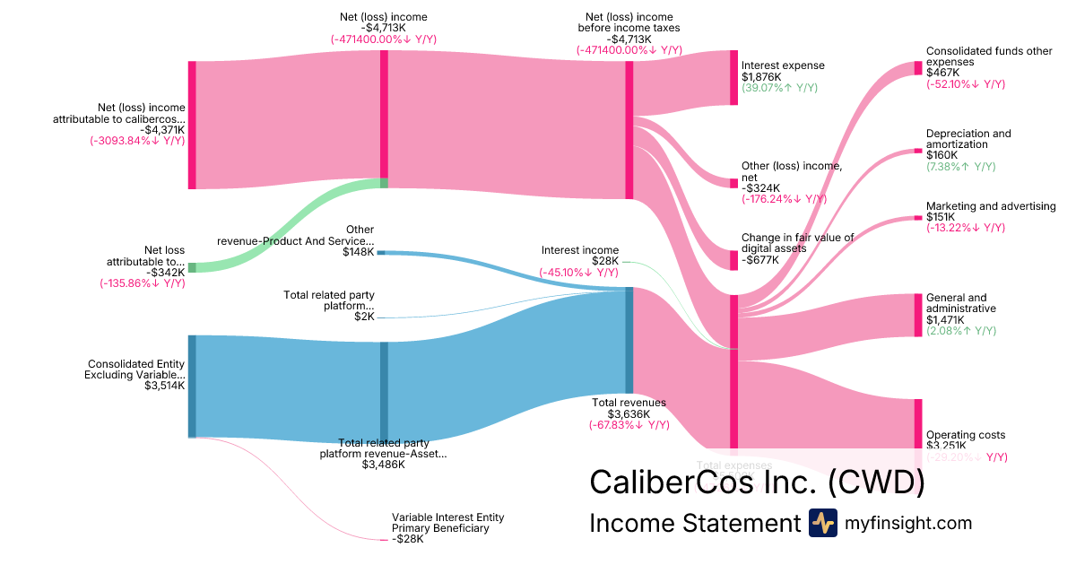 For the quarter ending 2025-09-30, CWD made $3,636,000 in revenue. -$4,371,000 in net income. Net profit margin of -120.21%.