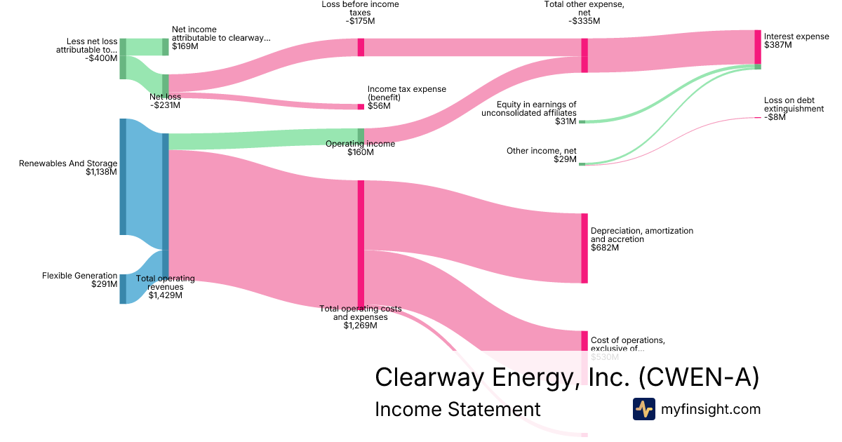For the year ending 2025-12-31, CWEN-A made $1,429M in revenue. $169M in net income. Net profit margin of 11.83%.