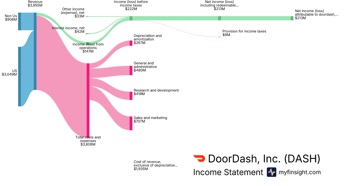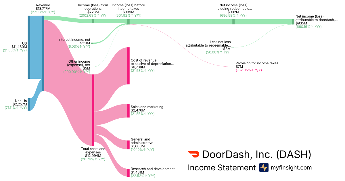 For the year ending 2025-12-31, DASH made $13,717M in revenue. $935M in net income. Net profit margin of 6.82%.