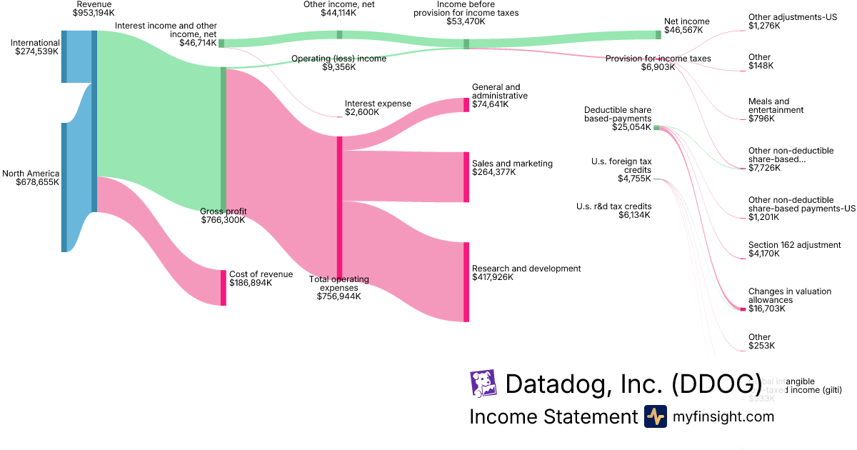For the year ending 2025-12-31, DDOG made $3,427,158K in revenue. $107,741K in net income. Net profit margin of 3.14%.