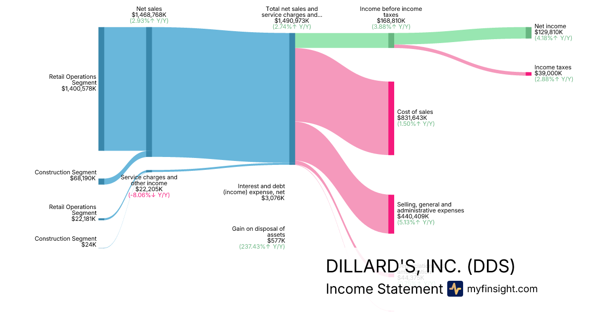 For the quarter ending 2025-11-01, DDS made $1,490,973K in revenue. $129,810K in net income. Net profit margin of 8.71%.