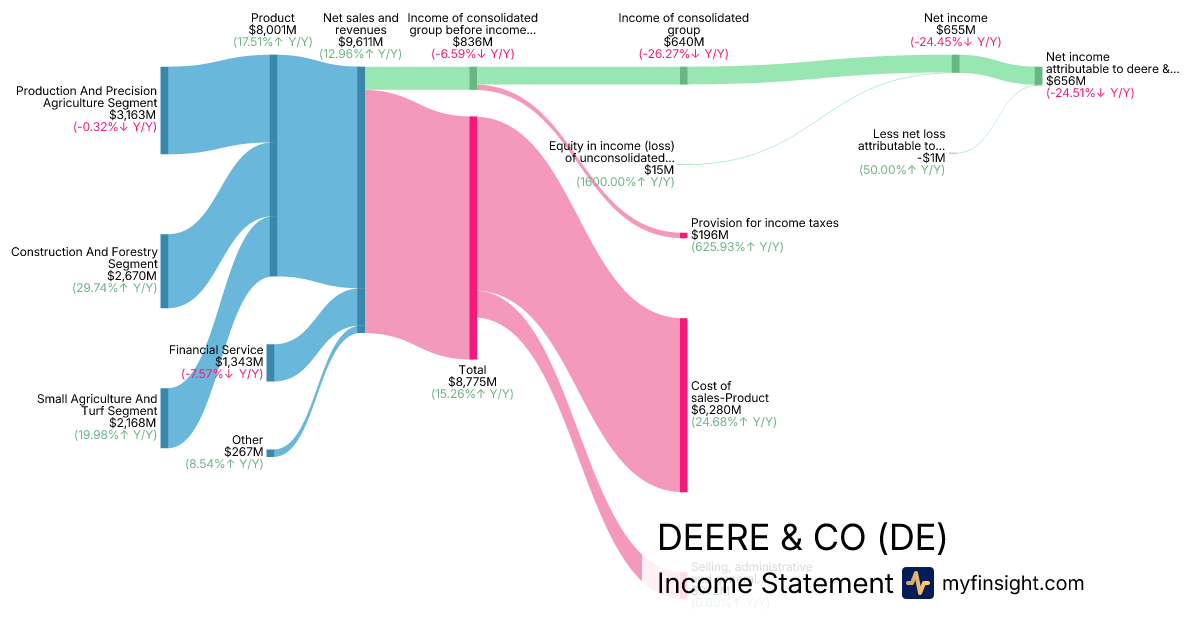 For the quarter ending 2026-02-01, DE made $9,611M in revenue. $656M in net income. Net profit margin of 6.83%.