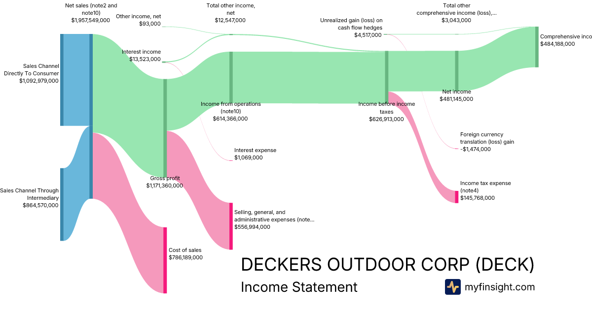 For the quarter ending 2025-12-31, DECK made $1,957,549,000 in revenue. $484,188,000 in net income. Net profit margin of 24.73%.