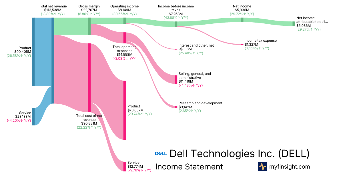 For the year ending 2026-01-30, DELL made $113,538M in revenue. $5,936M in net income. Net profit margin of 5.23%.