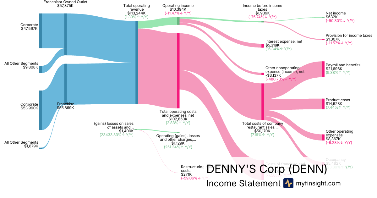 For the quarter ending 2025-09-24, DENN made $113,244K in revenue. $632K in net income. Net profit margin of 0.56%.