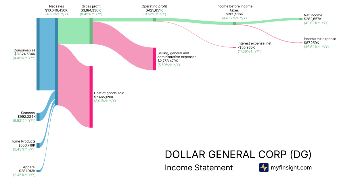 For the quarter ending 2025-10-31, DG made $10,649,450K in revenue. $282,657K in net income. Net profit margin of 2.65%.