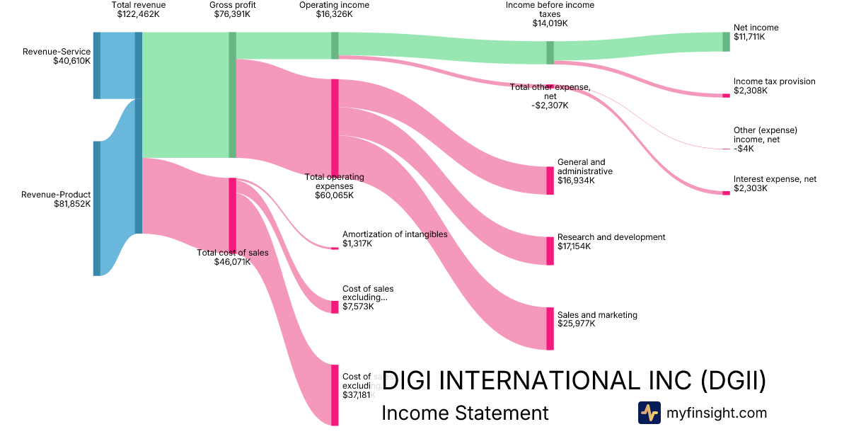 For the quarter ending 2025-12-31, DGII made $122,462K in revenue. $11,711K in net income. Net profit margin of 9.56%.