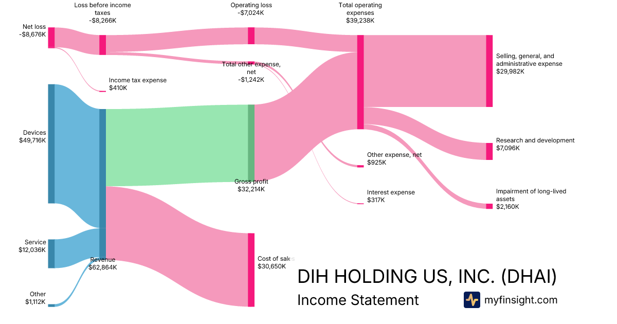 For the year ending 2025-03-31, DHAI made $62,864K in revenue. -$8,676K in net income. Net profit margin of -13.80%.
