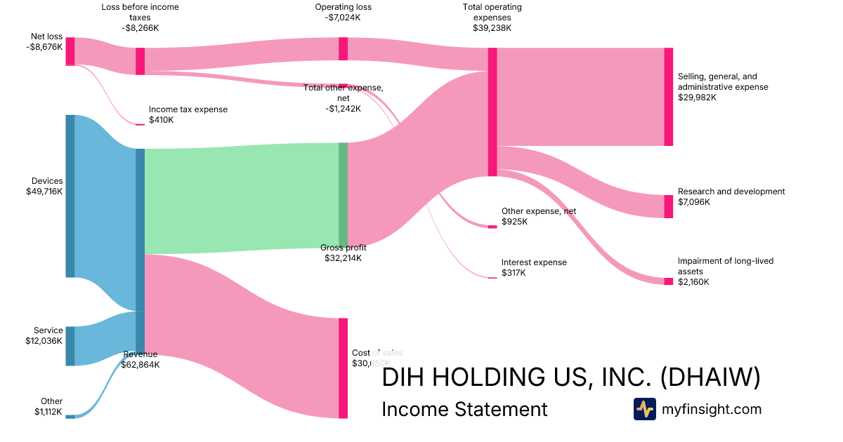 For the year ending 2025-03-31, DHAIW made $62,864K in revenue. -$8,676K in net income. Net profit margin of -13.80%.